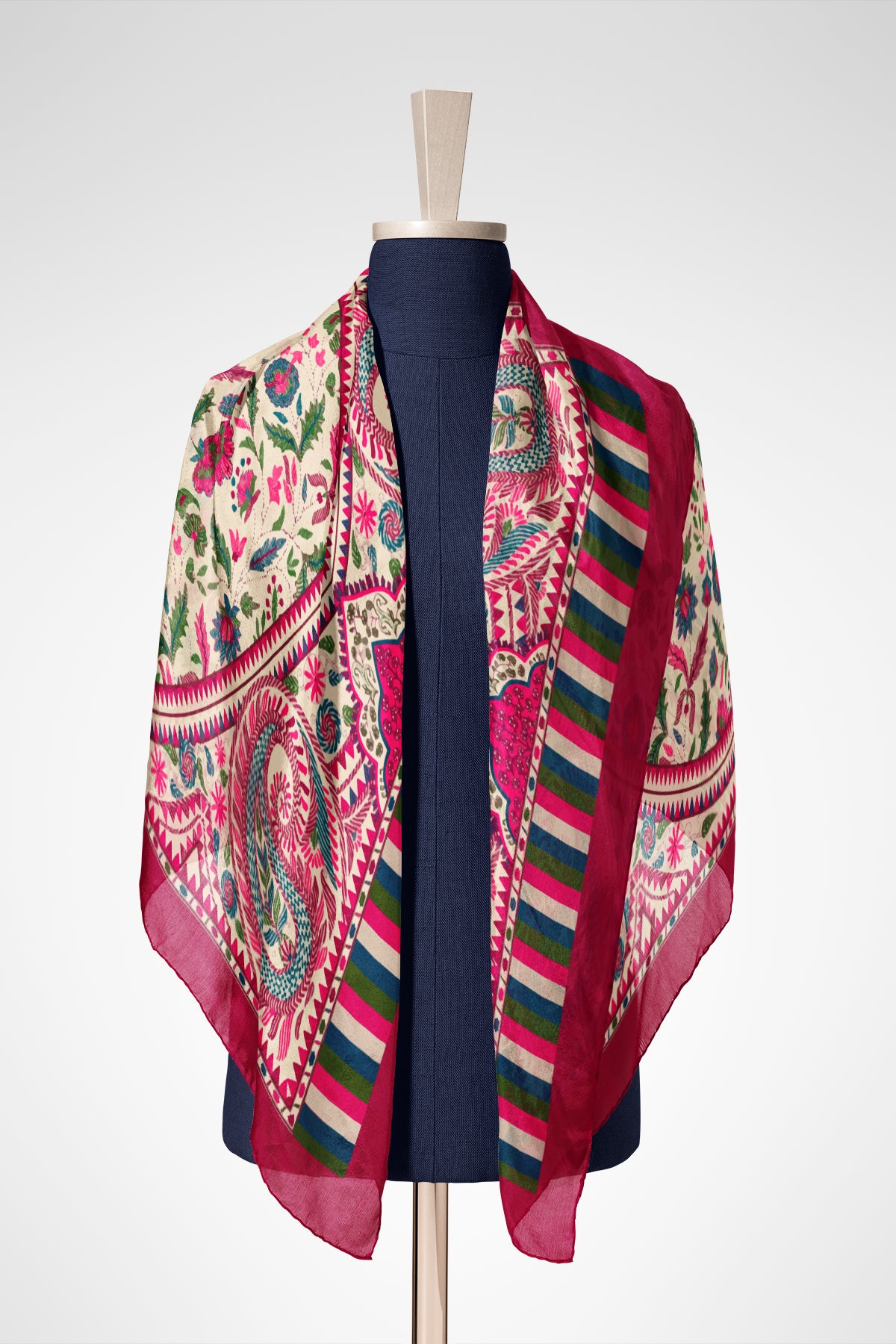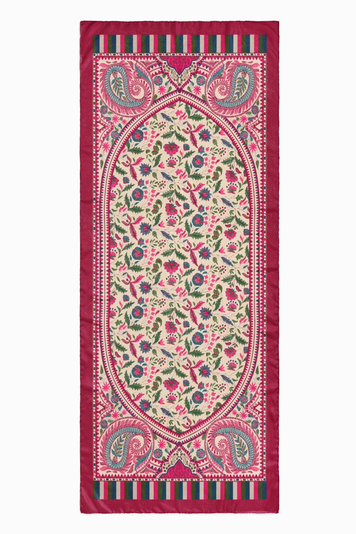 Geleneksel paisley (şal desen) ve floral motiflerin enerjik fuşya tonlarıyla yeniden yorumlandığı bu tasarım, etnik şıklığı modern bir enerjiyle sunuyor. Kenarlardaki çizgisel geçişler ve orta kısımdaki yoğun desen zenginliği, her bağlama şeklinde farklı bir detay ortaya çıkarıyor. Kombinlerine renk ve hareket katmak isteyenler için ideal bir aksesuar.