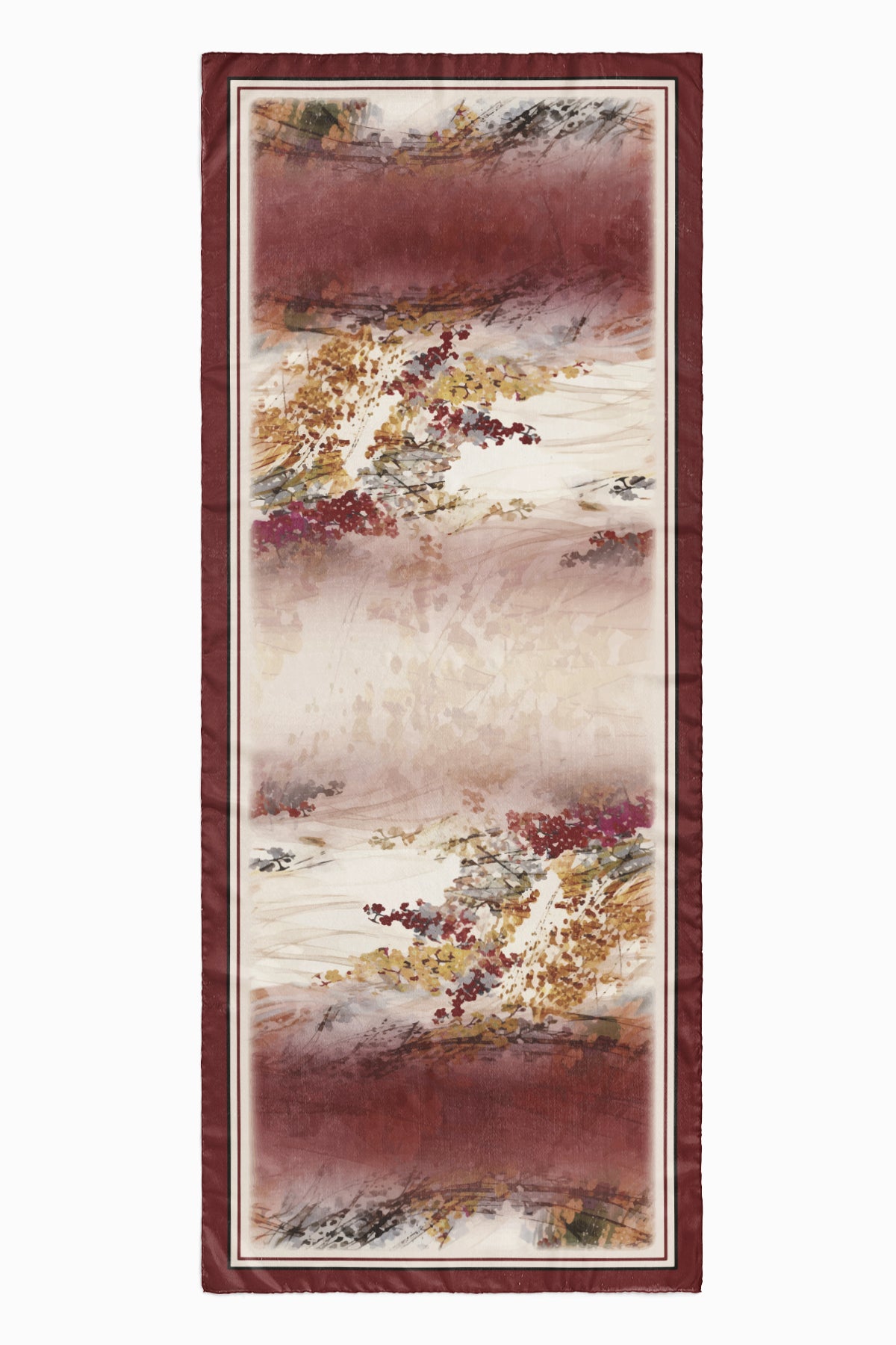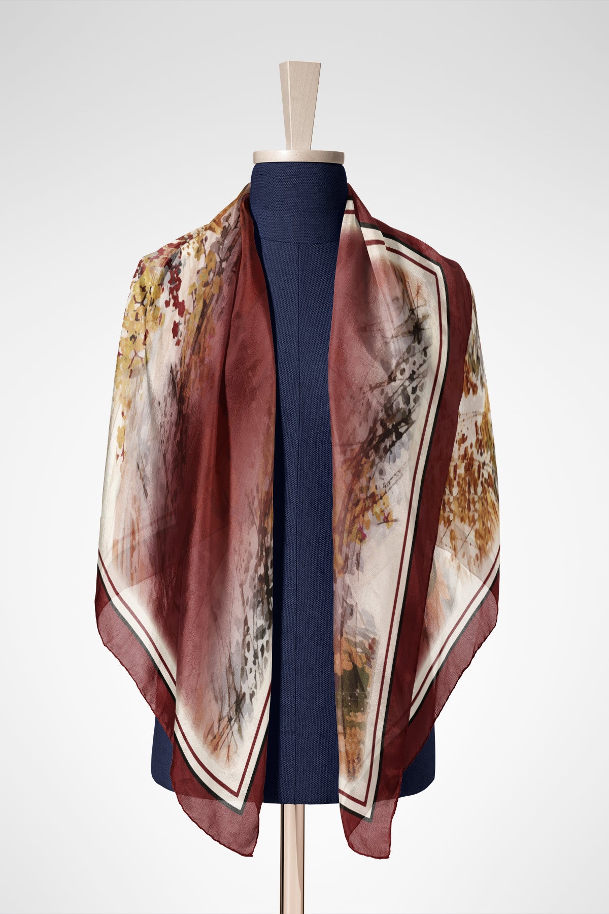 Safran alt tonlu şarap bordo zemin üzerine toprak ve krem geçişleriyle tasarlanan bu özel desen, mevsimlerin en zarif tonlarını bir araya getirir. Sanatsal fırça dokunuşlarını andıran yüzeyi sayesinde hem klasik hem modern kombinlerle uyum sağlar.