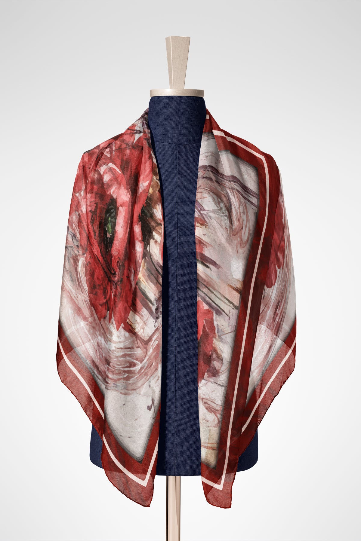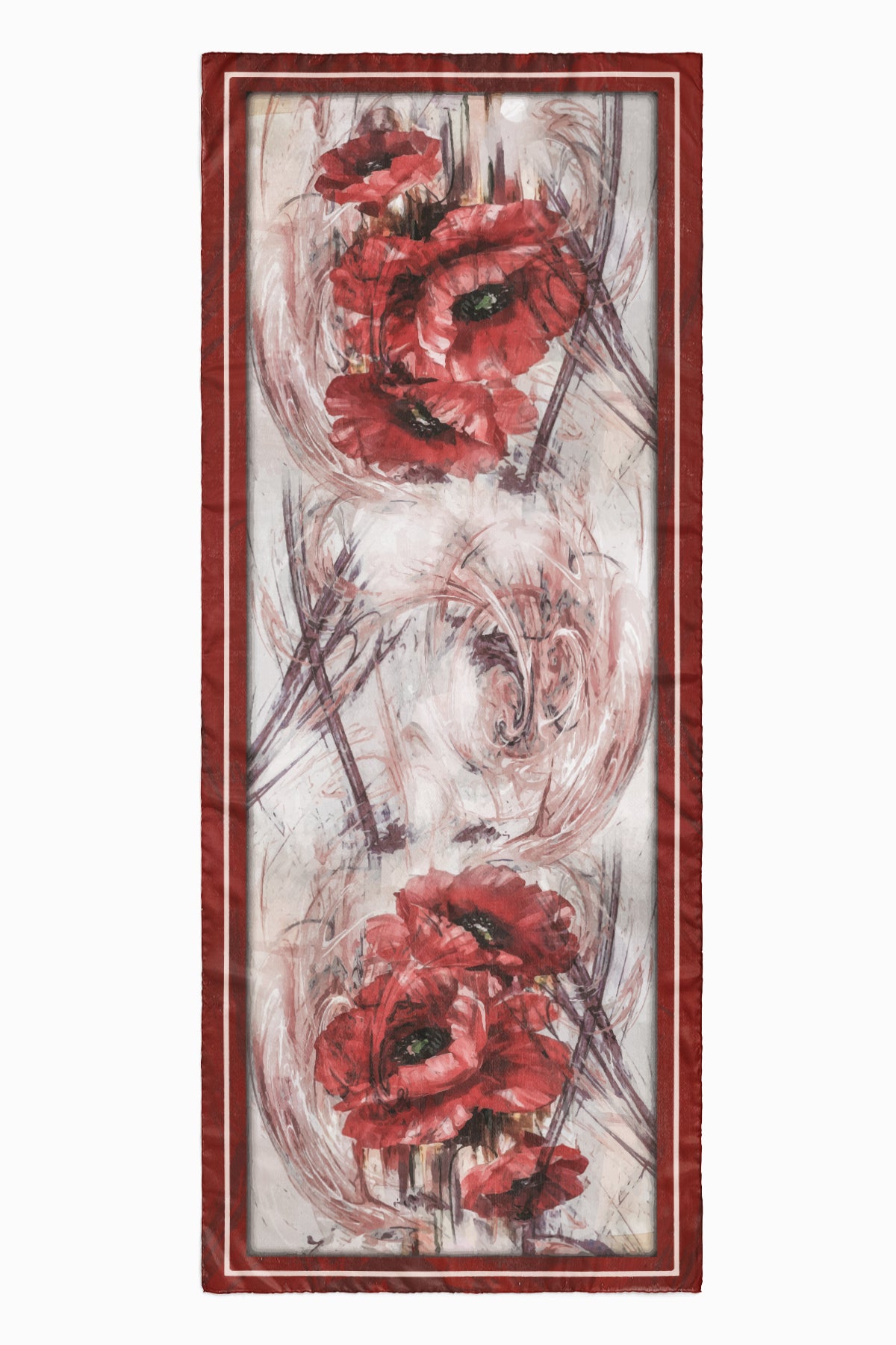 Derin bordo ve kiremit tonlarının kemik rengi zemin üzerindeki sanatsal dansı, stilinize dramatik bir zarafet katıyor. Fırça darbesi efektleriyle hayat bulan gelincik motifleri, klasik çiçek desenlerini modern bir illüstrasyon estetiğine taşıyor.