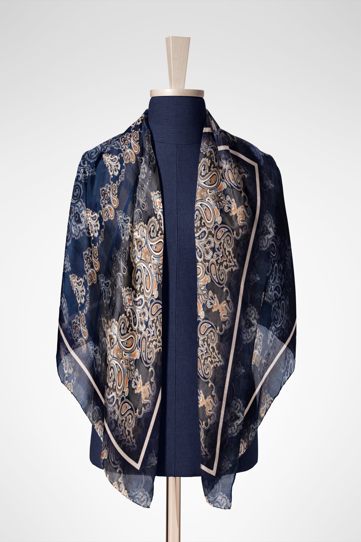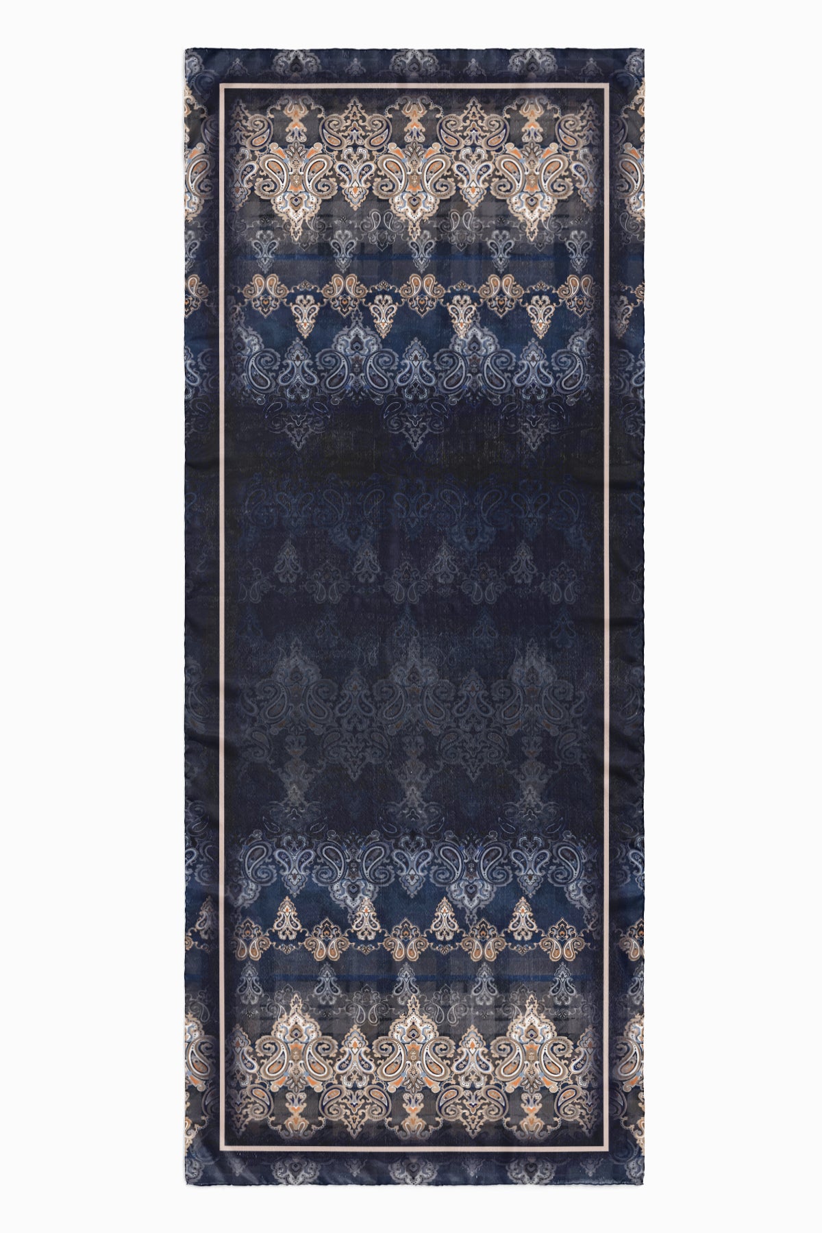 Derin gece mavisi ve lacivert zemin üzerinde yükselen geleneksel şal (paisley) motifleri, vizon ve altın tonlarının zarafetiyle buluşarak asil bir görünüm sunuyor. Katmanlı desen yapısı ve degrade geçişler, tasarıma mistik bir derinlik katarken; ince çerçeve detayı şalın formunu belirginleştirerek modern bir dokunuş sağlıyor.